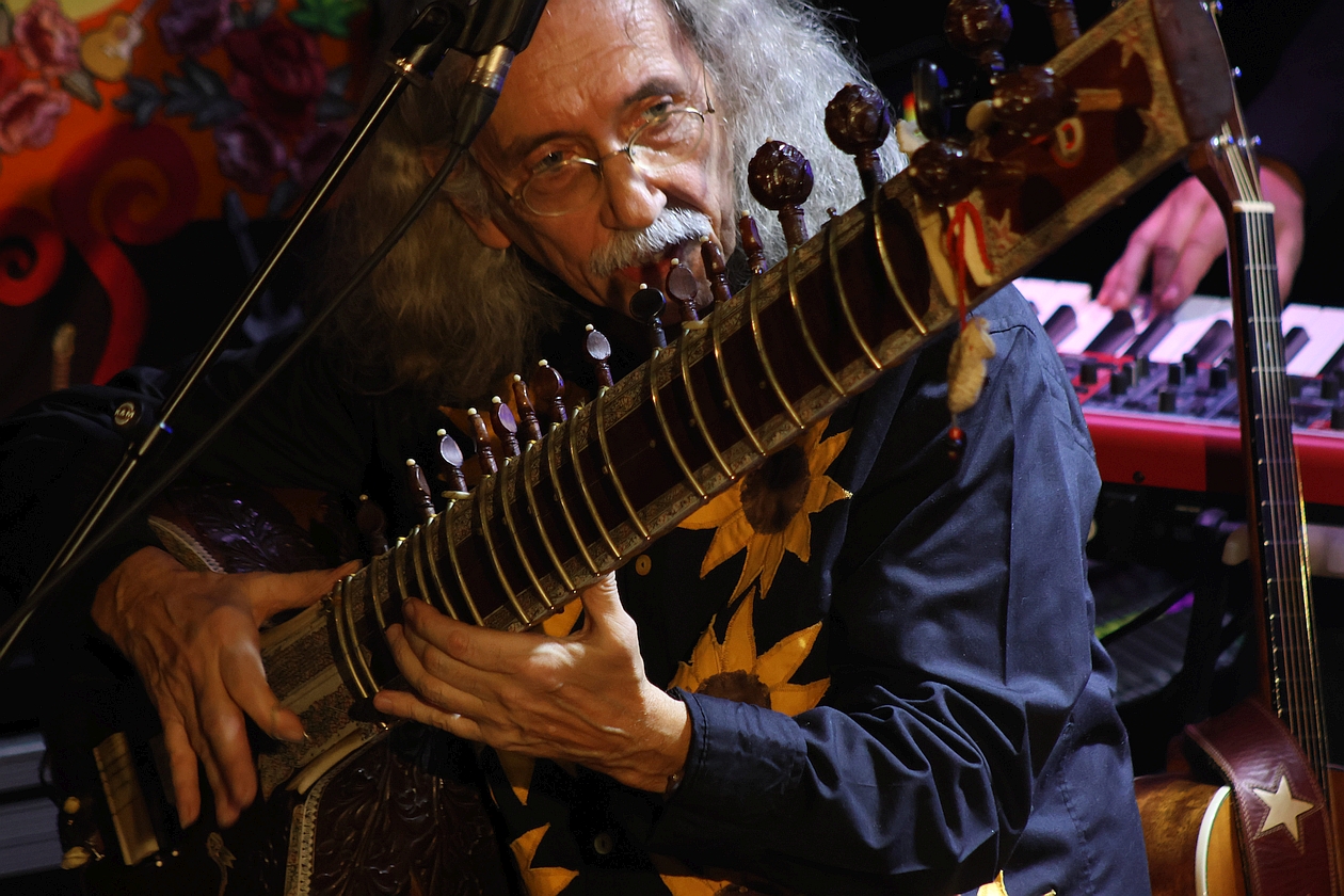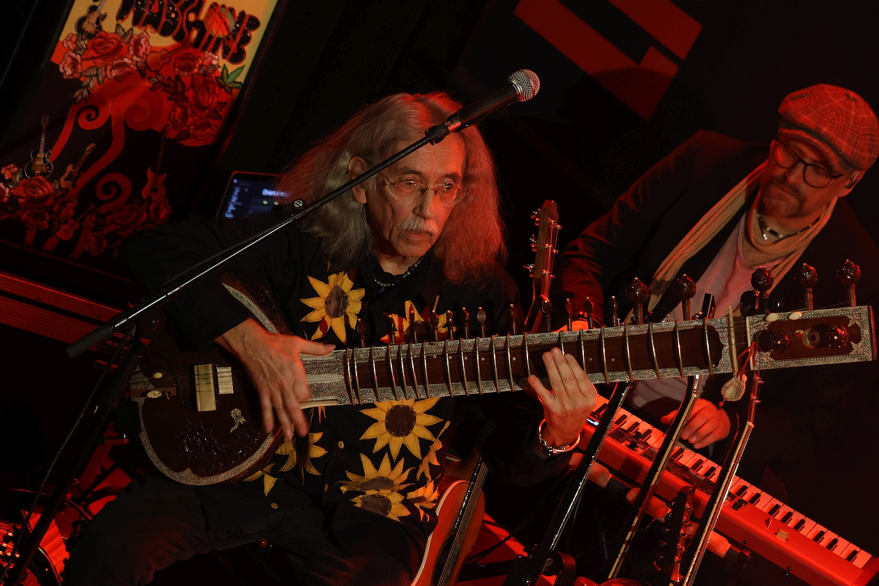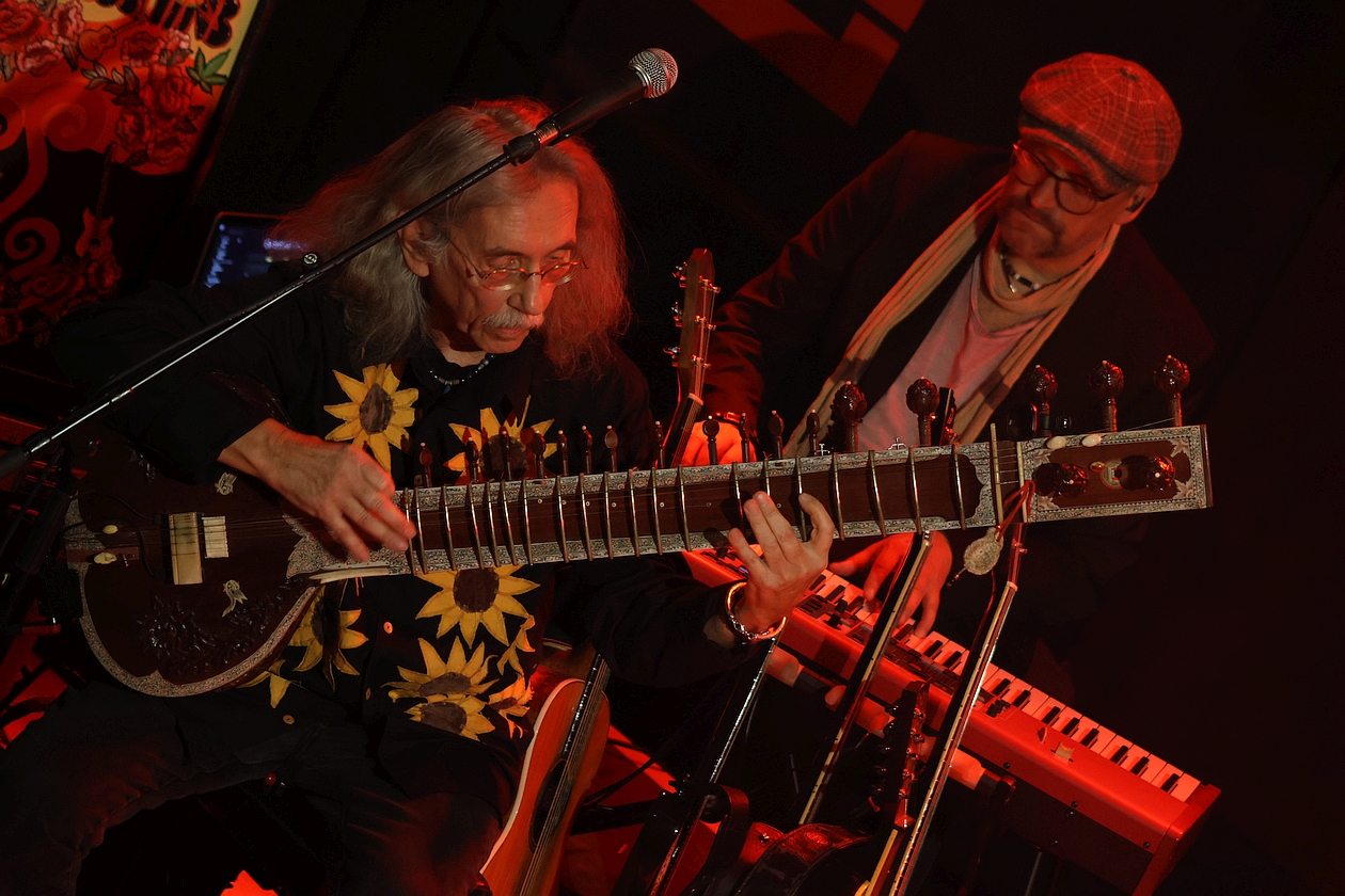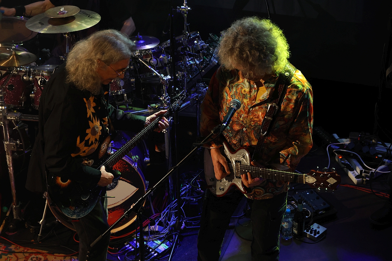 Dieser Konzertbericht ist allerdings nicht unser erster. Bereits aus Anlass des 50-jährigen BRÖSELMASCHINE-Bestehens besuchte mein Stellvertreter Stefan Haarmann im Oktober 2019 die „Elegy-Release-Tour“ im Duisburger Grammatikoff – so gesehen also ein echtes Heimspiel für Duisburger Weltmusik-Krautrocker – und verlieh seiner Begeisterung dazu Ausdruck, indem er feststellte: „Selten gibt es Bands, die es auch nach einem halben Jahrhundert schaffen, das Niveau vergangener Jahrzehnte nicht nur halten, sondern sogar noch steigern zu können […] Peter Bursch und seine Mitstreiter liefern einen denkwürdigen Auftritt, der die Qualität des aktuellen Albums 'Elegy' auch live demonstriert und die Ausnahmestellung als lebende Legenden unterstreicht, denen es gelungen ist, den Geist der Flower-Power-Generation ins Hier und Jetzt hinüber zu retten, ohne antiquiert zu wirken“.
