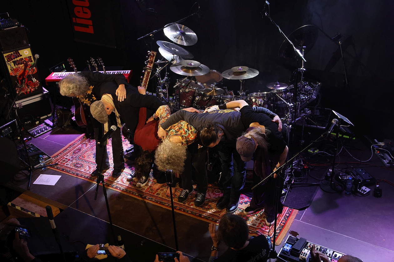 Am Ende des Konzerts aber stand die große Überraschung und zugleich kleine Sensation, über die hier unbedingt noch ein paar Gedanken verloren werden müssen. Es dreht sich natürlich um „Gedanken“, das erste Stück der ersten LP von BRÖSELMASCHINE, das auf Wunsch des Publikums das letzte des Konzerts werden sollte – und nicht vorher geprobt worden war, aber einen dermaßen fesselte und das unglaubliche Improvisationstalent der Band widerspiegelte. Hochexplosiv wie ein sic steigernder Bolero, bei dem sich BRÖSELMASCHINE in einen endgültigen Rausch spielten – so gesehen wurde aus diesem frühen Stück des Jahres 1971 anno 2026 ein echter „Gedanken“-Bolero.