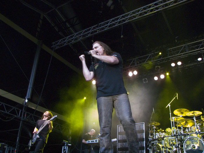 introvertierte Musik nicht auf einer großen Open Air Bühne und RIVERSIDE werden an diesem Abend leider ein wenig unter Wert verkauft. Dennoch bekommt Mariusz Duda Gelegenheit seine warmtönende Stimme wenigstens ein ums andere Mal zu Entfaltung zu bringen. Die Keyboards klingen live dominanter als auf Konserve und der Gitarrensound ist leider ein kleines bisschen zu sehr in den Hintergrund gemixt. Neue Fans haben die Polen wahrscheinlich nicht hinzugewonnen, doch wenigstens bekamen Kenner einen kleinen Eindruck, zu was für Großtaten RIVERSIDE in einem kleinen, atmosphärischen Club fähig sein müssen.DREAM THEATER legen pünktlich los und stürzen sich nach einer Intro auf das ehrwürdige „Scenes From A Memory“. „Overture 1928“ und „Strange Déjà-vu“ machen selbst aus dem Fotograben heraus Laune und steigern die Spannung, wie das neue Material sich live wohl machen wird. Etwas enttäuschend ist, dass nur drei Stücke von „Systematic Chaos“ zum Besten gegeben werden. Dafür ist „Constant Motion“ erwartungsgemäß ein echter Live Hit, der tausendmal mehr Laune macht, als das öde „As I Am“ vom „Train Of Thought“. Das von manchen als zu platt bezeichnete „Forsaken“ entfaltet durchaus Wirkung und das heftig vertrackte „The Dark Eternal Night“ lädt zum chiropraktischen Quadratwurzel-Headbanging ein. Der Sound ist äußerst transparent und auch erstaunlich leise. Was in den ersten Reihen eine schöne Sache ist, verkommt in den hinteren Reihen wahrscheinlich zum Ärgernis. Aber egal. Weitere Highlights der Show sind „Take The Time“ und das äußerst beeindruckende „Endless Sacrifice“ – ein weiterer Beweis dafür, dass einige Stücke live deutlich besser funktionieren als auf dem heimischen CD Player.