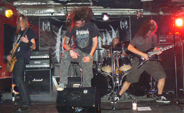 Womit wir bei CEPHALIC CARNAGE wären, die mir auf Konserve immer zu stressig und zerfahren sind. „Live geht das besser“, meint HARKONNEN-Sänger Phillip noch zu mir, bevor der optisch recht gemischte Haufen aus Colorado loslegt und Phillip sollte Recht behalten. Sie Zeichen stehen auf Grindcore und Sänger Leonard Leal erklärt auch gleich, warum das so ist: „Als Grindcore-Band kannst du machen, was du willst. Und Spaß haben.“ Das trifft den Nagel auf den Kopf und CEPHALIC CARNAGE hacken sich engagiert durch ein Set, das zwischen allen vorstellbaren Musikrichtungen pendelt, als Basis aber immer wieder zu ultraschnellem Gehacke zurückkehrt. Faszinierend ist nicht nur die Redneck-Frisur von Bassist Nick Schendzielos, sondern auch seine brillante Art den Fretless-Bass zu bearbeiten und nebenbei noch mit geschwollenen Halsvenen tiefe Growls abzuliefern. Amüsant ist am Ende des Sets die Black-Metal-Verarschung inklusive entsprechender Maskierung. Insgesamt präsentieren sich CEPHALIC CARNAGE als unterhaltsame Krachbrüder, die einen ausgeprägten Hang zu illegalen Rauchwaren zu haben scheinen, roch es doch in der Ecke mit den Gitarrenkoffern heftigst nach verbranntem Gras.