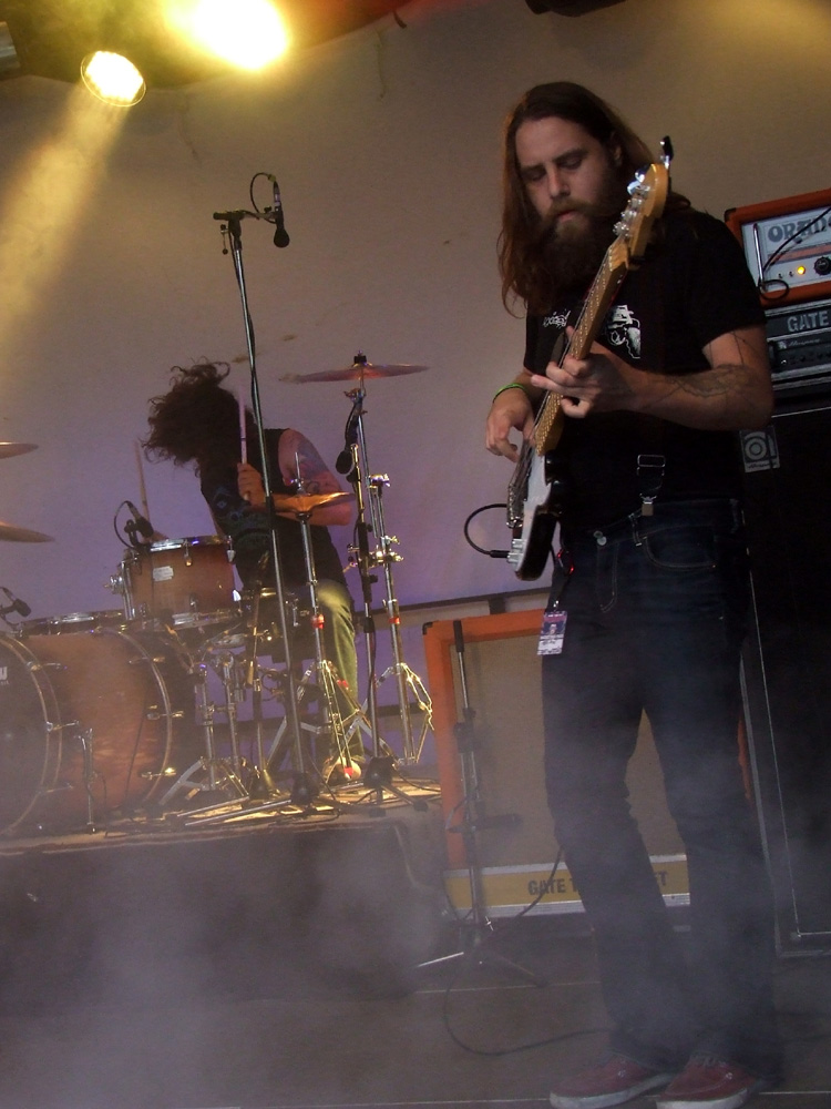 Die mit KATLA auf Tour befindlichen MAMONT fühlen sich von ihrem Namensgeber augenscheinlich nicht unter Druck gesetzt und mimen gar nicht erst die Trampeltiere. Ihr fetter Psychedelic Hard Rock erzeugt auch ohne viel Bewegung auf der Bühne ordentlich Druck, und Geburtstagskind Jimmy Karlsson freut sich am Schlagzeug sowieso über alles. Er lässt die Haare im Mammut-Groove fliegen, während sich Sänger und Gitarrist Karl Adolfsson lieber hinter seinen versteckt. Mit seinem Debüt „Passing Through The Mastery Door“ hat das Quartett in der Tat ein kleines Meisterwerk zwischen zeitgenössischem Stoner und Psychedelic Prog sowie Hard Rock der schwedischen Siebziger-Schule eingespielt. Es nutzt die Gunst der frühen Stunde, um den Anwesenden eine mächtige Breitseite zu verpassen. „Jag Sår Ett Frö“, „Creatures“ und „Satans Fasoner“ sind bären- … ähem, Mammut-starke Songs, die auch in einigen Jahrzehnten kaum an Ausdrucksgewalt einbüßen werden. Spielerisch voll auf der Höhe mag es der ebenfalls noch jungen Band ein wenig an Bühnenerfahrung mangeln, aber hier wächst zweifelsohne eine ganz spannende Truppe heran, die sich nicht auf Vintage Rock von der Stange reduzieren lässt, sondern mit Melodien im Stile alter Meister aufwartet und diese mit viel Herzblut füllt – nach meiner kauzigen Wahrnehmung die musikalisch stärkste Band des Festivals! Auch abseits der Bühne erweisen sich die Schweden als Überzeugungstäter: So lässt es sich Drummer Jimmy im Anschluss nicht nehmen, einen anderen Fan und mich mit großer Begeisterung auf die ersten Alben von Hansson und Karlsson hinzuweisen. Der Mann schwebt ohnehin im siebten Himmel: er freut sich auf UNCLE ACID & THE DEADBEATS und Geburtstags-Muffins mit Mammut obendrauf lassen ihn zum Honigkuchenpferd mutieren.