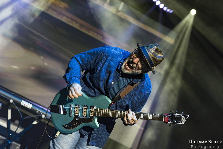 Erneute Umbaupause und der Initiator der G3-Tour Joe Satriani betritt die Bühne. Hier wird klar, wer heute hier nicht nur das „letzte Wort“, sondern auch die meisten Fans hat. Die Applauskulisse ist der eindeutige Beweis. Auch wenn Satriani bei seinen Auftritten immer „Gesichtskirmes“ hat und ein ebenso breites Grinsen, ist offensichtlich, dass ihn der frenetische Applaus sehr freut. Er spielt halt mit dem ganzen Körper! Die 61 Jahre sieht man Satriani wirklich nicht an. Aber vermutlich macht das seine „Haarpracht“ und die allgegenwärtige Sonnenbrille. Satriani ist mit der Band „Beer For Dolphins“ als LineUp aufgelaufen, die auch beim anschließenden Jam auf der Bühne bleiben. Aufgrund seiner Position als Initiator der G3-Tour und als ständiger Headliner steht ihm mehr Bühnenzeit zur Verfügung als seinen beiden „Rock-Brüdern“. Diese Zeit nutzt er auch und lässt das Publikum zu jeder Zeit spüren, dass ihm die Bühne gehört.