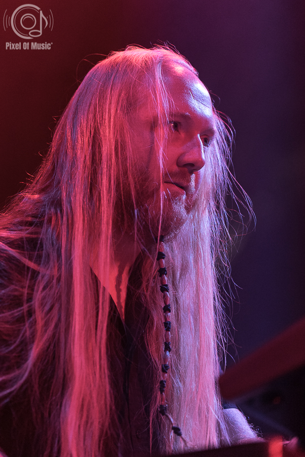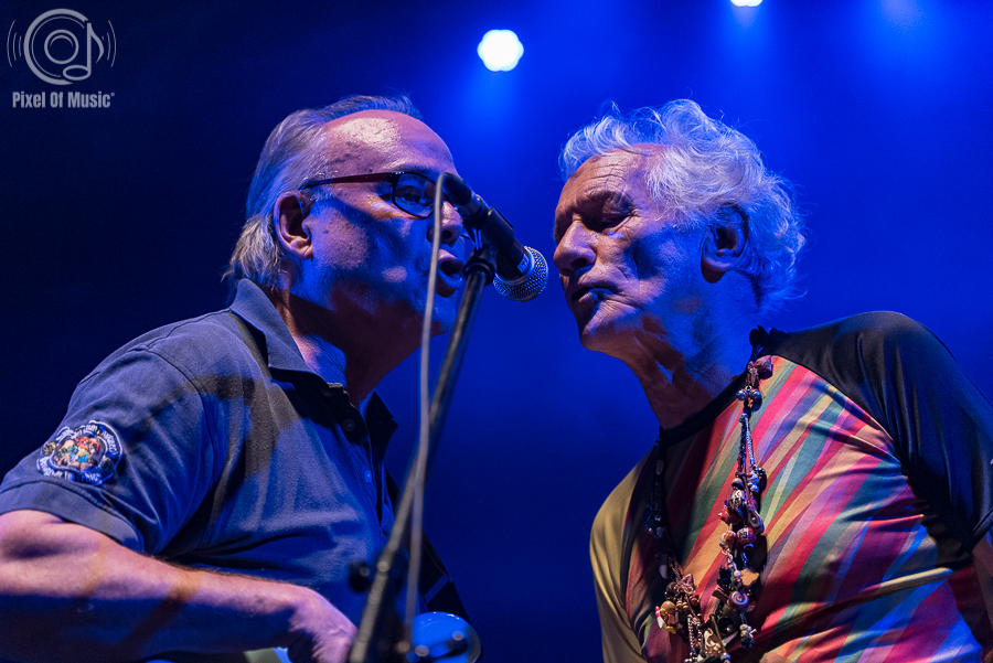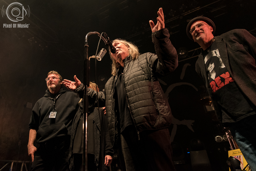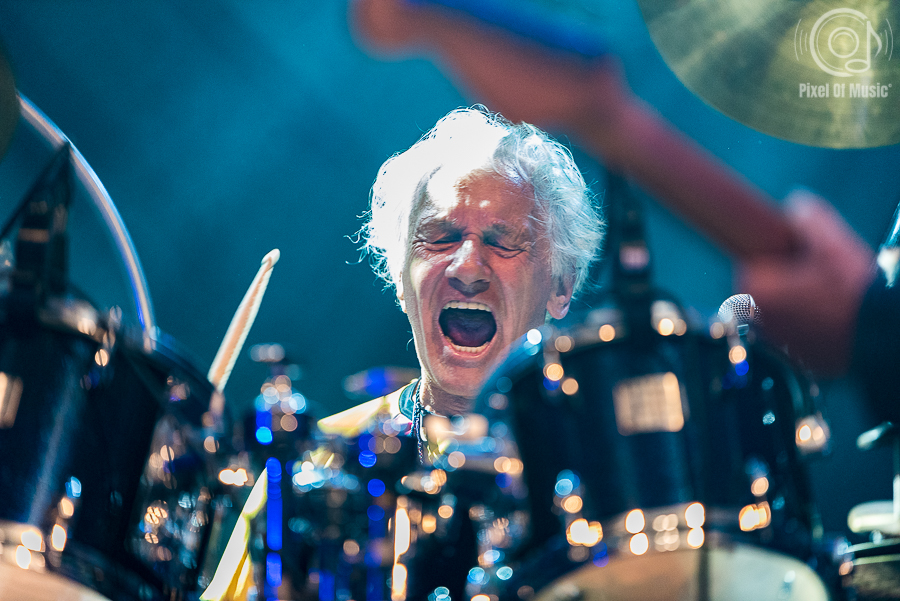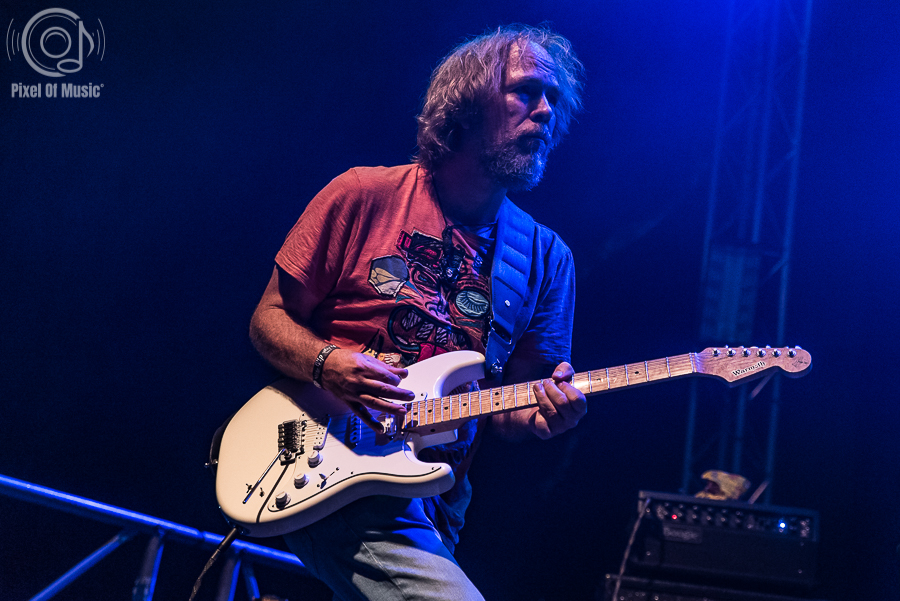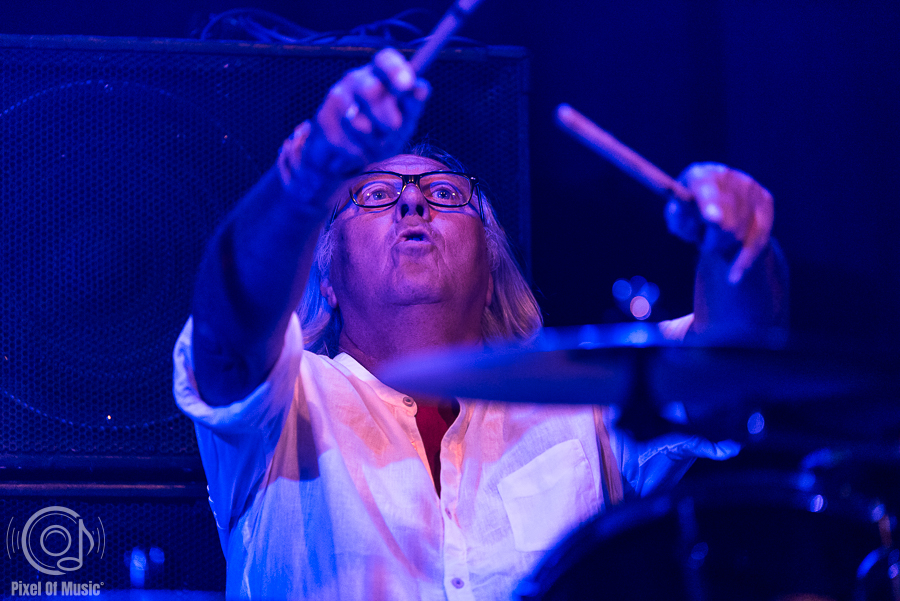 Nach ca. 30 Minuten Umbaupause kamen dann die nächsten Krautrock-Saurier auf die Bühne. Guru Guru, um den bald 78-jährigen Sänger und Schlagzeuger Mani Neumeier, enterten die Bühne. Mani hat die Formation mit dem leider bereits 2009 verstorbenen Bassisten Uli Trepte 1968 als The Guru Guru Groove gegründet. Die aktuelle Besetzung neben Mani Neumeier ist Roland Schaeffer (Gitarre, Saxophon, Nadaswaram, Gesang), Peter Kühmstedt (Bass, Gesang) und Jan Lindqvist (Gitarre, Lapsteel, Gesang). Wenn ich mal 78 werden sollte, dann möchte ich gerne so fit sein wie Mani Neumeier. Es war einfach unglaublich was dieser Krautrock-Methusalix an diesem Abend abgeliefert hat. Chapeau!