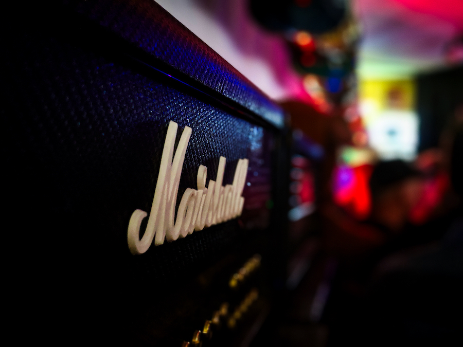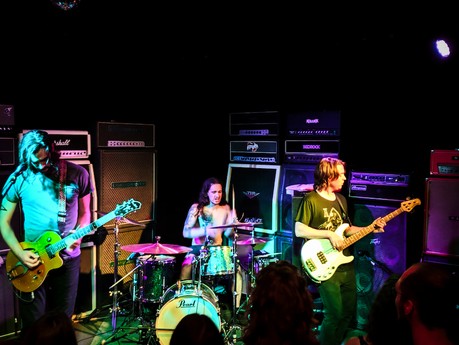 Betritt man den Raum, stechen einem direkt die einschlägigen Devotionalien ins Auge. Die Wände hängen voll von Gitarren jeglicher Couleur, kurz nach dem Eingang, im vorderen Teil des Raumes, befinden sich eine Sofaecke inklusive Mischpult sowie eine Theke und im hinteren Teil ist eine kleine Bühne aufgebaut, auf der die Bands, eingerahmt von etlichen Boxen und Amps, ihr Stelldichein geben. Eine Konzerthalle auf kleinstem Raum sozusagen. Selbstverständlich wird es bei diesen Gegebenheiten vor der Bühne immer ein bisschen eng, vor allem, weil man quasi an dieser vorbeimuss, um zur Toilette zu gelangen. Aber das macht eigentlich nur noch mehr den Charme dieser sympathischen Location aus. Sehr angenehm ist dazu die Möglichkeit, in den Umbaupausen vor der Tür Luft schnappen und in Ruhe ein Bier trinken zu können, ohne irgendwen großartig zu stören.