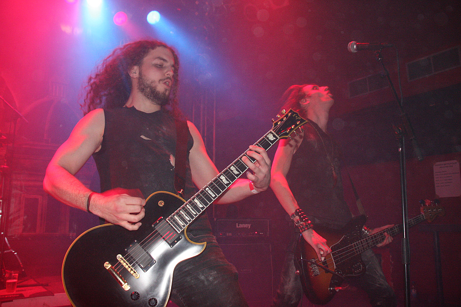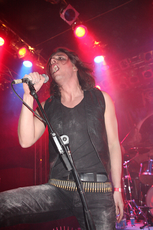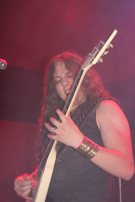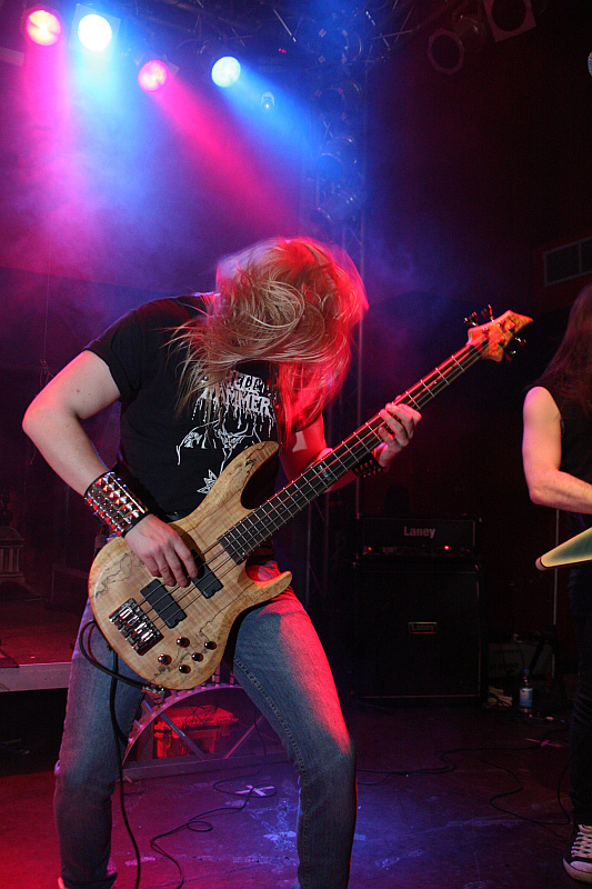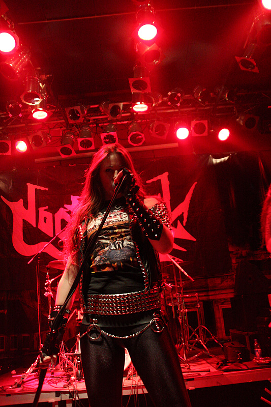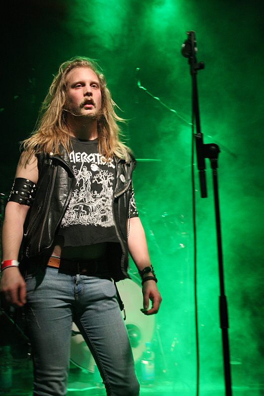 Zeit für Nieten, Ketten, Kutten und Leder - und für große Posen. Die Black Thrasher NOCTURNAL sind zumindest von der Erscheinung her die derbste Band des Abends und rocken das Turock gewaltig. Der schwarze, rasante Thrash Metal der eher rumpeligen Art kommt beim Publikum bestens an und so sieht man überall fliegende Matten - auf der Bühne und im Publikum. Zwar sind die garstigen Vocals von Frontbiest Tyrannizer, die heute unbestritten der optische Höhepunkt ist, etwas leise abgemischt, das fällt jedoch nicht weiter ins Gewicht. Sie und ihre Mitstreiter bangen, als ginge es um ihr Leben und haben auch sonst jede relevante Metallerpose auf Lager. Das wirkt jedoch zu keiner Sekunde aufgesetzt, sondern überaus authentisch - Stichwort Herzblut. Man merkt NOCTURNAL wirklich an, wieviel Spaß sie an der Sache haben. Angesichts von soviel Enthusiasmus kann man auch darüber hinweg sehen, dass die technischen Fähigkeiten der Band eher limitiert sind und man eigentlich von charmantem Gerumpel sprechen muss. Standesgemäß wird der letzte der zwölf Songs mit "Death to false metal" angekündigt und es erklingt ein rabiates Cover von MANOWARs "Kill With Power".
