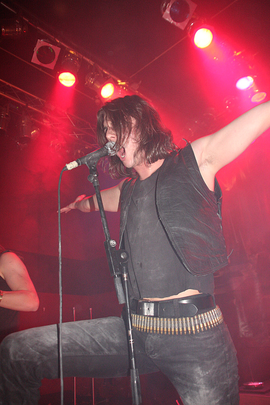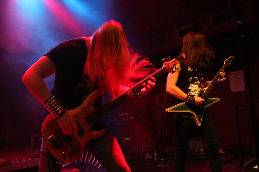 Die längste Fahrt an diesem Abend haben ANTICHRIST aus Schweden. Die kommen jedoch mit einiger Verspätung in Essen an, weil sie mit dem Zug anreisen (!) und der wegen eines Selbstmörders auf der Strecke nach Düsseldorf umgeleitet wird. Irgendwie schaffen sie es aber trotzdem noch rechtzeitig ins Turock. Beim Anblick der Band fragt man sich jedoch, wie die anderen Mitreisenden im Zug wohl auf die Jungs reagiert haben, denn mit ihren Schnurrbärten, die so gar nicht zu den sonst jungen Gesichtern passen, sehen sie schon arg komisch aus. Auch sonst ist der Look der Band überaus retro geraten und die Vermutung, dass der Zug mit dem sie gekommen sind, nicht direkt aus den 80ern kam, muss erst einmal glaubhaft widerlegt werden. Auf Zeitreise geht man auch musikalisch, der thrashige Speed Metal (oder umgekehrt, das ist Ansichtssache) ist nämlich ebenso herrlich altbacken, wie der Look. Zwar sieht Sänger Steken mit seinem Schlafzimmerblick irgendwie müde aus, von Erschöpfung ist auf der Bühne aber nichts zu merken, denn auch ANTICHRIST schütteln die Haare zu den Songs ihres Debüts "Forbidden World" ohne Unterlass. Coole Band, auch wenn ihre Musik nicht so geil ist, wie Fenriz es uns weismachen will.