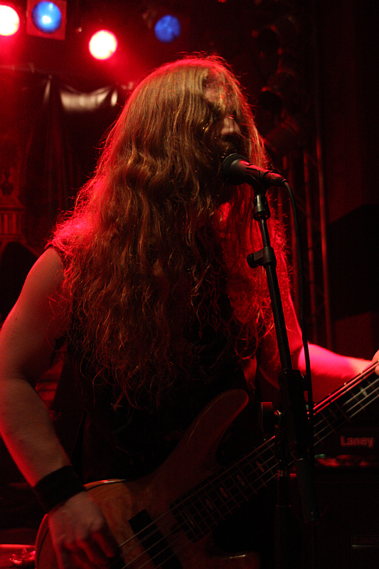 Bei ALCHEMYST wird vor allem deutlich, dass für Konzertbilder aus dem Turock demnächst ein vernünftiges Blitzlicht oder ein lichtstärkeres Objektiv her muss. Denn die recht düster gehaltene Lichtshow erlaubt es mit dem vorhandenen Equipment kaum, gute Bilder zu schießen. Das Licht passt jedoch gut zum Sound der Band, die vor einem ziemlich großen Backdrop spielt. Doomiger, sperriger Black Metal mit viel Atmosphäre ist das Metier der Band aus Thüringen, die auf der Bühne ein gutes Bild abgibt. Die Schlaghose vom zentral agierenden Basser Abgal Ibbur (der sonst bei HELLISH CROSSFIRE an der Gitarre steht) passt zwar nicht so ganz in Bild, aber sei's drum. Die Band, die bisher noch kein Albumrelease vorweisen kann, spielt sieben Stücke und hinterlässt einen professionellen Eindruck, auch wenn ihr Material nicht unbedingt leicht verdaulich ist.