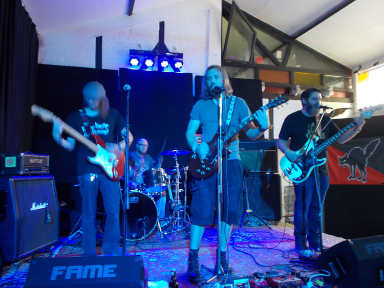 Bei der Stoner-Rock-Band DRIVE BY WIRE aus den Niederlanden steht mit Sängerin Simone Holsbeek die einzige Frau am heutigen Tage auf der Bühne, was die Musikerin selbst verwundert. Mit dem neuen Album "Spellbound" hat das Quartett einige kleine Hits im Gepäck, doch wollen diese nicht so zünden, wie sich das die Band erhofft. Der Bass knarzt ganz wunderbar, die Gitarre ist zu leise, Simone lässt sich trotz zwei überschaubaren Reihen von Zuhörern die gute Laune nicht verderben, und Alwin Wubben nutzt den Raum vor der Bühne für einen Ausflug mit seiner Gitarre. Seine Verwendung einer Kölsch-Flasche zum Sliden auf dem Griffbrett dürfte als eine bemerkenswert sinnvolle Verwendung dieser sonst fragwürdigen Erfindung in die Geschichte der Do(o)mstadt eingehen. Auch bei DRIVE BY WIRE behält die Spielfreude die Oberhand, gleichwohl bereits während des Gigs klar ist: Hier wäre mehr drin gewesen.