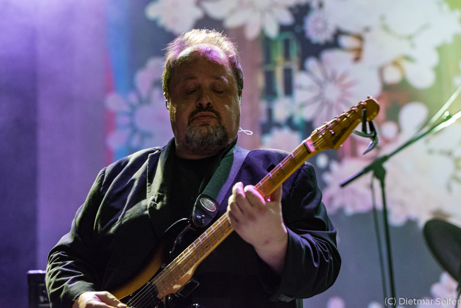 Ian Mosley saß so versteckt hinter seiner Schießbude, dass er zumindest aus dem Fotograben für mich kaum sichtbar war. Der Bassist Pete Trewavas stellt mich allerdings vor eine Herausforderung. Da er sein Spiel häufig durch stakkatoartige Körperbewegungen unterstützt, hieß es „Offenblende“ um möglichst kurze Belichtungszeiten zu erreichen.
