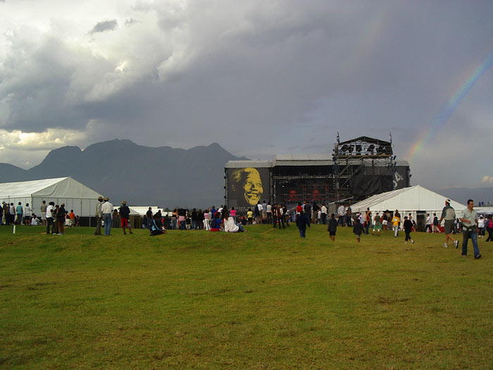 Es wird dunkel, Hubschrauber kreisen über dem Festival, ab jetzt wird auch für’s Fernsehen übertragen. Eine nervige Moderatorin faselt dummes Zeug. Annie Lennox betritt die Bühne und hält eine leidenschaftliche Rede gegen HIV und die Art, wie in Südafrika mit der Krankheit umgegangen wird. 20% (kein Tippfehler) der Bevölkerung sind HIV positiv, zehn bis zwölf Millionen weitere Menschen sind HIV positiv und wissen es noch nicht. Sie spricht von einer Epidemie, die mittlerweile zu einem wahren Genozid heranwächst und die Politiker des Landes würden nichts bzw. viel zu wenig tun.