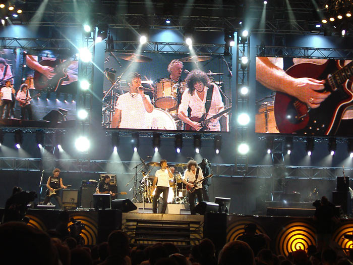 Die Stimmung ist etwas gedämpft, als Katie Melua auftritt. Die Britin präsentiert einen gefälligen Akustik-Pop-Folk, ein bißchen nachdenklich, ein wenig melancholisch. Die Zuschauer fressen ihr aus der Hand. Nächster Überraschungsgast ist Will Smith, der nun den weiteren Abend moderiert. Die Stimmung steigt senkrecht an. Die Menge rastet aus, als Nelson Mandela die Bühne betritt. Der 87jährige wird wie ein Held verehrt. Körperlich sichtlich angeschlagen, aber geistig fit hält er seine Rede. Nach weiteren Auftritten von Annie Lennox und einigen südafrikanischen Bands wie Black Sun ist es endlich soweit: Knapp neunzehn Jahre nach ihrer letzten Tour beginnt für Queen die erste neue Welttournee in Südafrika. In den 80ern ist die Rock Legende leider etwas in zu sehr in Pop-Musik Regionen abgedriftet, in den 70ern haben die vier Ausnahmemusiker aber ein geniales Rock/Prog/Metal-Mix Album nach dem anderen abgeliefert. Nachdem es Ende der 80er, Anfang der 90er musikalisch wieder stark bergauf ging, ist mit Freddie Mercury im Jahre 1991 einer der besten Sänger aller Zeiten gestorben. Nach dem posthum veröffentlichten „Made in Heaven“ war ab 1994 Funkstille in Sachen Queen. Die undankbare Aufgabe, in Freddie Mercurys übergroße Fußstapfen zu treten, übernimmt ex-Free Sänger Paul Rodgers. Am Bass fehlt leider John Deacon, der seit 1991 praktisch nicht mehr in der Öffentlichkeit gesehen wurde. Dennoch reichen Brian May und Roger Taylor aus, um so etwas wie Queen-Atmosphäre aufkommen zu lassen - die beiden haben den Sound von Queen, abgesehen vom Gesang, ja auch überwiegend geprägt.