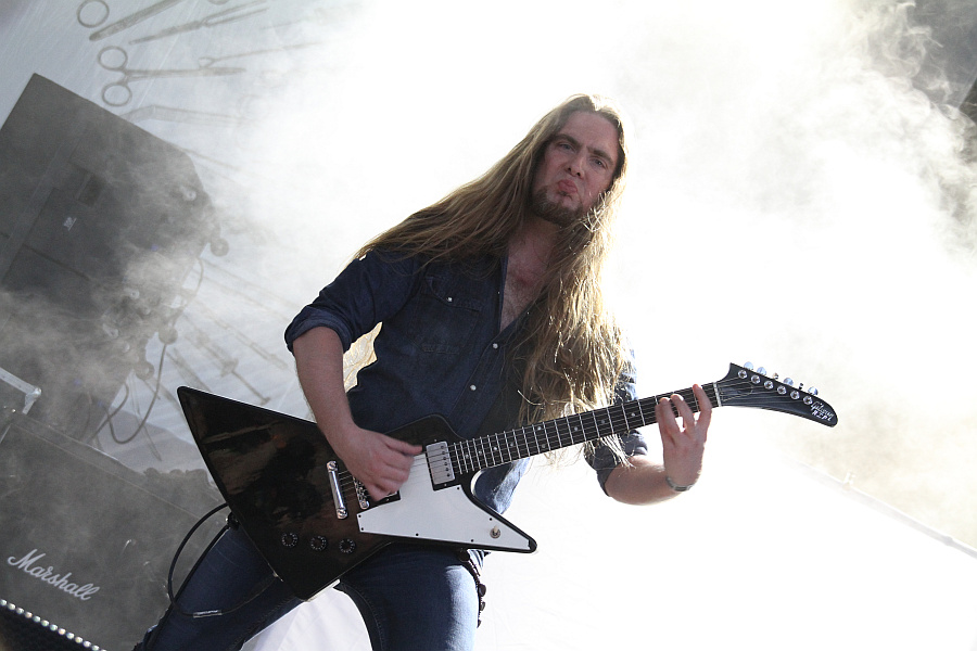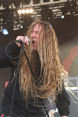 Auf eine dänische Legende folgt eine floridianische. Ja, die Death Metaller von OBITUARY kann man durchaus so bezeichnen, denn sie gelten nicht nur als Genre-Pioniere, sondern haben auch das Kunststück vollbracht, mit "The End Complete" das meistverkaufte Death-Metal-Album aller Zeiten zu veröffentlichen. Für das Rock Hard Festival hat man sich ein Klassiker-Set vorgenommen und nicht zu viel versprochen. Denn das 15-stückige Set besteht fast ausnahmslos aus Songs der ersten drei Alben "Slowly We Rot", "Cause Of Death" und eben jenem "The End Complete". Hier kommen die Altfans der Band also voll auf ihre Kosten und auch der Band sieht man den Spaß an der Sache deutlich an. Sänger Jon Tardy stampft im Rhythmus über die Bühne und lässt seine langen Locken fliegen, wenn er nicht gerade seine Nicht-Lyrics ins Mikrofon growlt und auch Gitarrist Trevor Peres lässt sich nicht lumpen und überzeugt mit ausdrucksstarker Mimik und Gestik, während er sein Instrument bedient. Vor der Bühne ist es richtig voll, die Stimmung ist bestens, die Sonne hat die Wolken wieder vertrieben und weil auch der Sound richtig gut ist, gerät auch der Auftritt von OBITUARY zu einem Höhepunkt des Festivals. Das sehen wohl auch Phil Rind von Sacred Reich und Jeff Walker von Carcass so, die sich diesen Auftritt nicht entgehen lassen wollen und das Geschehen neben der Bühne verfolgen. (ASZ)