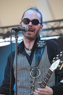 SÓLSTAFIR nachmittags um Viertel vor Vier bei 30°C im Schatten. Das kann nicht klappen. Zu spröde, zu kühl, zu wenig partytauglich ist die Musik der Isländer, als dass sie damit die Meute im Amphitheater begeistern könnte. Könnte man meinen. Zugegeben, die Musik der Band ist recht speziell und tatsächlich nicht dazu geeignet, übermäßige Bewegung im Publikum auszulösen. Stattdessen stellt man sich lieber hin, schließt die Augen und genießt die wunderbare Musik, die da erklingt. Während des Intros gibt es aber zunächst ein paar technische Probleme mit einem Amp, der nicht so will, wie er soll. Also wird das Intro so lange von Gitarrist Sæþór Maríus Sæþórsson gespielt, bis alles läuft und man mit "Ljós í Stormi" in ein viel zu kurzes Set startet, das aus gerade mal vier Songs besteht - kein Wunder, wenn allein drei der vier Stücke schon gut 35 Minuten ausmachen. Der psychedelische Dark Rock mit dem leicht schrägen Gesang wird besonders von Sæþórssonn mit einer stoischen Ruhe gespielt, auch Basser Svavar Austman schränkt seinen Bewegungsradius auf ein Minimum ein, während zumindest Sänger und Gitarrist Aðalbjörn Tryggvason immer mal wieder für seltsame Posen an den Bühnenrand kommt und zeigt, wie er der Gitarre mit dem E-Bow langgezogene Töne entlockt. Wobei Bühnenshow völlig irrelevant ist, wenn eine Band einen Übersong wie "Fjara" zum Besten geben kann. Es folgt noch "Goddess Of The Ages", das den anwesenden Damen gewidmet wird, danach ist Schluss mit einem aus musikalischer Sicht überragenden Auftritt, der gerne doppelt so lang hätte ausfallen dürfen. Und man hält fest, dass SÓLSTAFIR auch nachmittags bei heißem Wetter funktionieren, wenn man sich auf ihre Musik einlässt. Traumhaft!