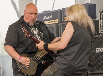 Nach der Eröffnung durch zwei jüngere Bands stehen mit SINNER die ersten alten Recken des Tages auf der Bühne. Natürlich darf man keine allzu großen Überraschungen von den Herren um Mat Sinner erwarten, aber die braucht es auch nicht unbedingt. Man merkt zu jeder Sekunde, dass hier erfahrene Musiker am Werk sind und dementsprechend routiniert (aber nicht gelangweilt) werden Klassiker wie "Bad Girl" und das Billy-Idol-Cover "Rebel Yell" zum Besten gegeben. (LH)