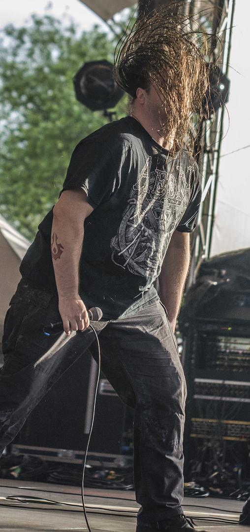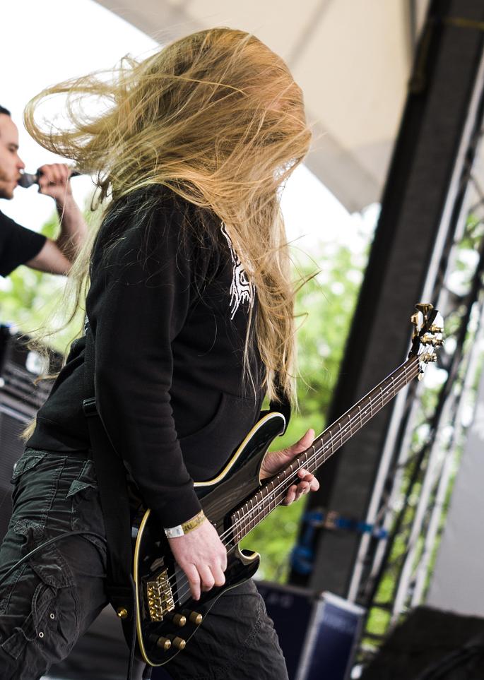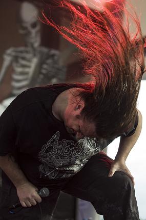 neuen Schoten (das Titelstück ihre neuen und bislang wirklich rundesten Veröffentlichung "Procreation Of The Wretched", dazu "To Cosmic Shores" und "Megacorpse" als Finale) auch auf den Backkatalog-Putz und generell fett ins Mett. Für eine kleine Combo - solche haben es als Auftakt zum Endspurt bei Festivals meistens schwer - schlagen sich die Hessen nicht bloß gut. Zum Glück klart es auch ein klein wenig auf, kaum dass Rock-Hard-Schreiber Sebastian und Co. gegen Mittag beginnen, und einmal mehr beweist das Publikum dieses Open Airs, dass es zu den begeisterungsfähigsten und durch kaum etwas zu erschütternden im Land zählt. Das Quintett, dem der neue Sänger nicht nur dank Arschlanger Dreadlocks einen verhältnismäßig modernen Anstrich verleiht, denkt beim Songwriting dankenswerterweise hier und da mal um die Ecke, statt sklavisch entweder die Schweden- oder Ami-Tod-Schiene abzuklappern. Am Ende braucht man dann auch keine Showeinlagen wie Pyros oder Flammensäulen (siehe die viel zu hoch eingeschätzten Deserted Fear), um als Sympathieträger des Tages mit Empfehlung für wesentlich höhere Weihen (angesichts des relativen Underground-Status der Band) von den Brettern zu steigen. (AS)