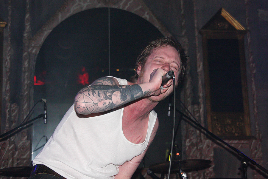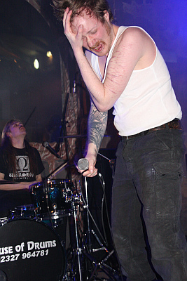 Ganz im Gegensatz zu FÄULNIS. Die zocken eine punkig-rockige Variante von suizidalem Black Metal und haben den wohl auffälligsten Frontmann des Tages in ihren Reihen. Seuche nennt der Knabe sich und besticht zunächst durch seine Optik: kurze Haare, Oberlippenbart und ein weißes Wifebeater-Unterhemd, das seine vernarbten Oberarme besonders gut zur Geltung bringt. Sieht schön asozial aus und auch mit seiner gesamte Gestik und Mimik stellt er den durchgeknallten Irren mehr als überzeugend dar. Offensichtlich haben FÄULNIS auch eine entsprechende Anhängerschar – selten hat man so viele Leute mit geritzten und vernarbten Armen in den ersten Reihen eines Konzerts gesehen. Und die Zerschnittenen bejubeln den Auftritt frenetisch und singen die Songs begeistert mit. Man kann natürlich geteilter Meinung darüber sein, wie sinnvoll es ist, selbstverletzendes Verhalten und die damit einhergehende psychische Störung so demonstrativ zur Schau zu stellen (Stichwort Nachahmer), aber in gewisser Weise macht das auch stark den Reiz dieser Band aus. Seuche schreit, brüllt, gröhlt und leidet sich mit Inbrunst durch die eingängigen, wirklich gut rockenden Songs seiner tight aufspielenden Band und pöbelt Leute an, die NSBM angeblich nur wegen der Musik hören. Im kurzweiligen Set ragen vor allem die Songs „30. Juli, bewölkt“, „Gespien“ und „Landgang“ heraus und so kontrovers es auch sein mag, ist der Auftritt von FÄULNIS komplett stimmig und deshalb bei aller Geschmackssache ein Tageshighlight.