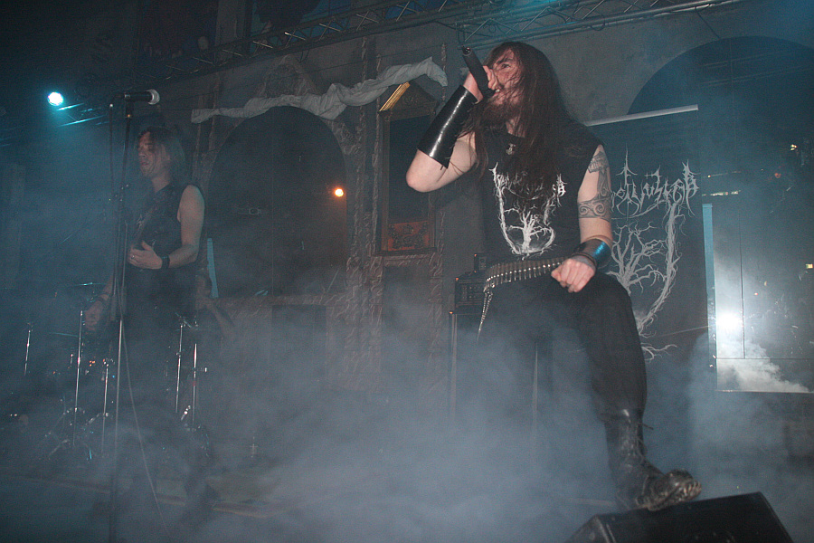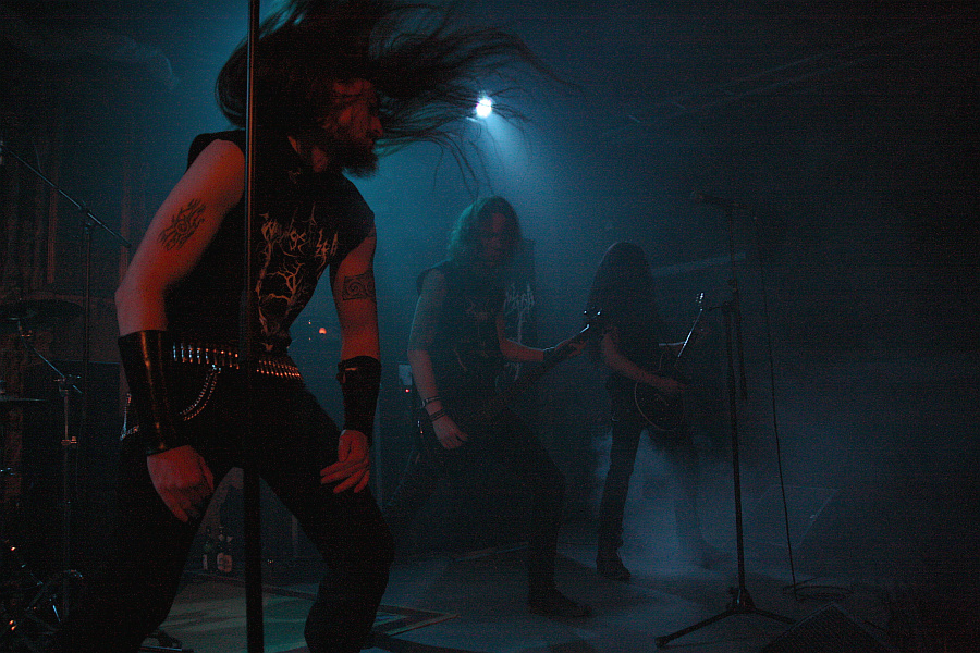 Um Punkt 16 Uhr fällt der Startschuss für einen langen Konzertabend mit der Münchener Band WALDGEFLÜSTER und vor der Bühne ist es jetzt schon erstaunlich voll. Wer bei dem Bandnamen folkloristisches Geschunkel erwartet, wird getäuscht. Die Band um Sänger Winterherz spielt atmosphärischen, melodischen Black Metal der zumeist im Midtempo dargeboten wird. Die Songs haben gerne mal Überlänge, so dass in den 40 Minuten Spielzeit gerade mal fünf Nummern gespielt werden, darunter „Seenland“ und „Fichtenhain“ vom aktuellen Longplayer "Femundsmarka - Eine Reise in drei Kapiteln“ sowie „Wotan sang“ vom „Herbstklagen“-Debüt. Winterherz hat eine gute Bühnenpräsenz und bietet seine Songs mit Leidenschaft und nicht zu derbem Gekreisch dar und entledigt sich zum Ende des Sets seines Shirts. Die Band steht ein bisschen im Hintergrund, erledigt ihre Aufgabe aber souverän. Das Publikum ist angetan von der Darbietung und spendet deutlich mehr als nur Höflichkeitsapplaus. Zahlreiche Matten fliegen schon jetzt und dass die Band prima ankommt zeigt auch die Tatsache, dass man hinterher zahlreiche WALDGEFLÜSTER-Shirts im Publikum sieht.