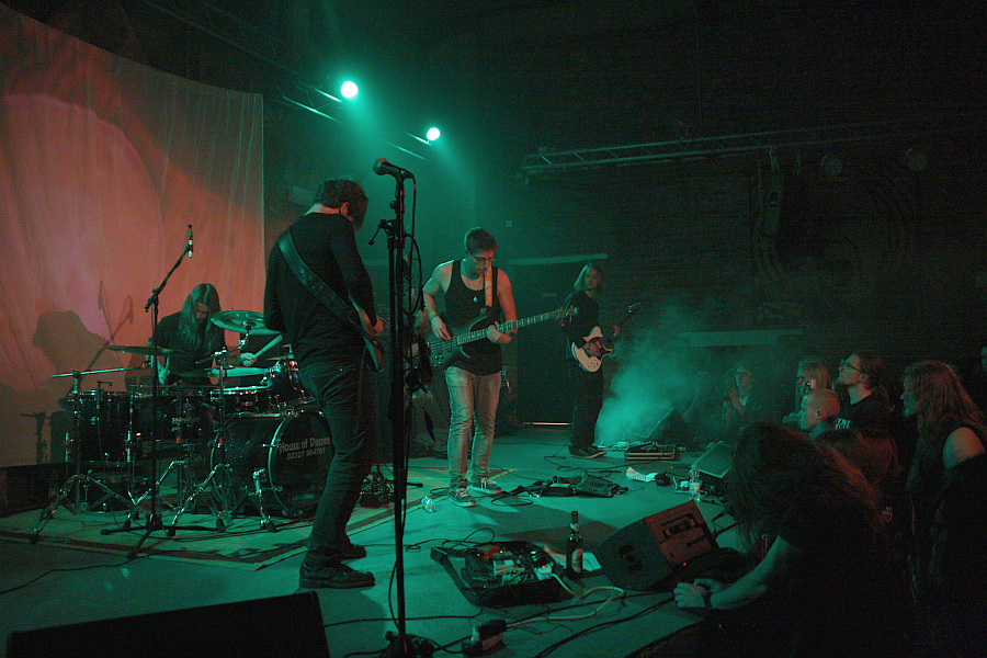 Als nächstes steht mit WASSERMANNS FIEBERTRAUM eine Band auf dem Plan, die den wenigsten bekannt sein dürfte. Der Bandname lässt Texte zum Fremdschämen befürchten, doch die Angst ist unbegründet – es gibt nämlich gar keine Texte. Die deutsch-österreichische Band spielt komplett instrumentale Musik, die mit Black Metal so gut wie nichts zu tun hat, sondern viel mehr dem Postrock zuzuordnen ist. Der Vortrag des Ganzen überzeugt jedoch auf ganzer Linie. Sicherlich ist es ein Wagnis, eine solche Band auf einem solchen Festival spielen zu lassen, doch das Experiment muss man klar als geglückt bezeichnen. Mit viel Enthusiasmus und Spielfreude präsentiert das Quartett neun Songs, die mit wirklich schönen Melodien ausgestattet sind und nicht dahinplätschern, sondern viel Drive und Schmiss haben. Damit das Ganze auch optisch Reiz bekommt, hat man ein großes weißes Tuch als Backdrop aufgehängt, auf das stimmungsvolle Videos projiziert werden. Zwar wirkt der Auftritt auf Dauer leicht eintönig, da die Melodien eine gewisse Beliebigkeit innehaben, doch im Endeffekt haben WASSERMANNS FIEBERTRAUM eine ansprechende Visitenkarte abgegeben.