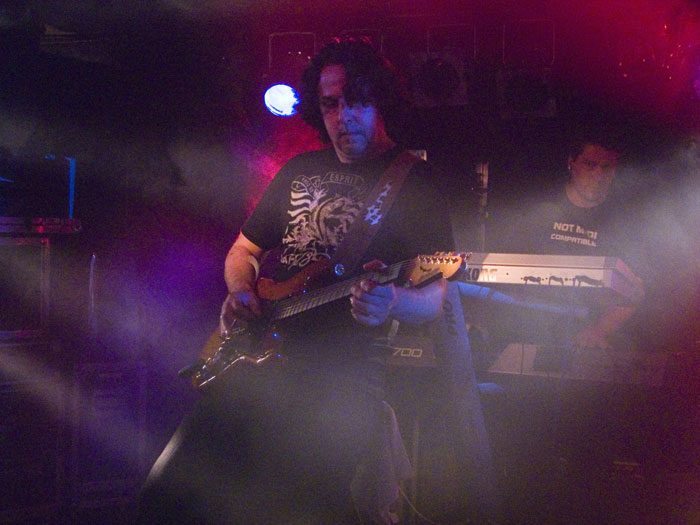 im Laufe des Konzerts aber bessert (oder die Ohren des Rezensenten haben sich einfach daran gewöhnt…). Die Hamburger konzentrieren sich erstmal auf die beiden neusten Alben und bringen auch Stücke vom düster-melancholischen Konzeptalbum „Posthumous Silence“ – erstaunlich, wie diese introvertierten Stücke live funktionieren: Bei den „spoken word“ Passagen vom Band kommt richtig Gänsehautstimmung auf. Gutes Stichwort! Guido Bungenstock legt ein paar leidenschaftliche Soli hin, daß es einem wohlig den Rücken rauf und runter läuft: Das ist leidenschaftliche Musik zum Mitfühlen und –erleben!