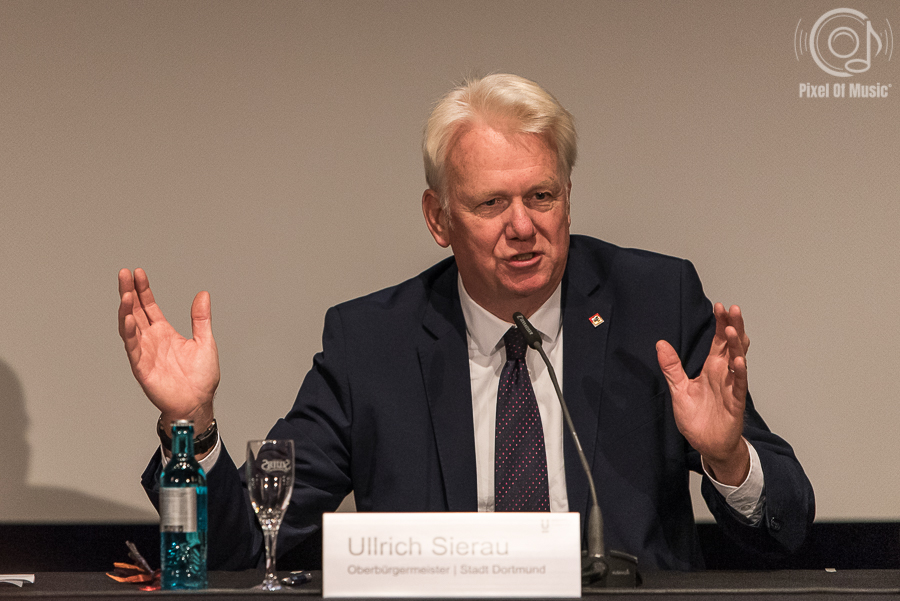 Nach einleitenden Worten der Pressereferentin erfolgte die offizielle Begrüßung durch Ulrich Sierau, der darauf hinwies, dass er 1981 leider in Burma war und an keinem der aufeinanderfolgenden sieben Eventabende der Tour „The Wall“ teilnehmen konnte. Bis heute ist „The Wall“ das meistverkaufte Doppelalbum der Welt. Vom Oberbürgermeister konnte man dann noch erfahren, dass er sein Studium als Stagehand in der Westfalenhalle finanziert hat. Er kann also anpacken.