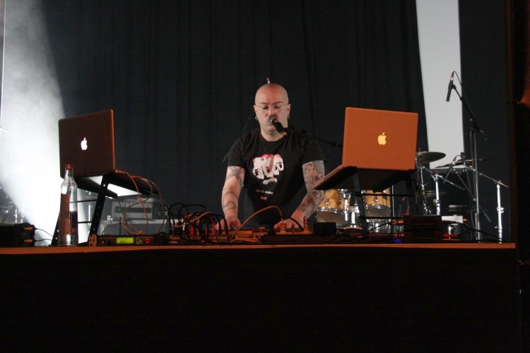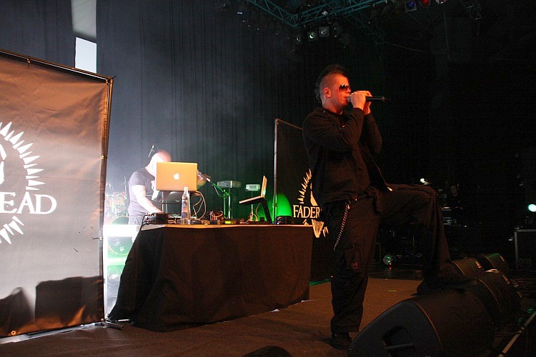 Die ist dann auch für FADERHEAD ein bisschen zu groß geraten. Der Hamburger Produzent hat sich zwar mit Marco Visconti von XP8 verstärkt und ist so in der Lage, ein bisschen mehr Action auf der Bühne zu machen, als wenn er selber an den Geräten stehen würde, doch der Funke springt noch nicht so recht auf das Publikum über. Insgesamt zehn Stücke werden gespielt und besonders bei den neueren Songs fällt auf, dass diese melodischer geworden sind und mehr Wert auf den Gesang legen, als die deutlichen club-lastigeren, älteren Stücke. Von diesen vermisst man dann auch prompt "The Protagonist" und "O/H Scavenger". Neuere Clubhits wie "Dirtygrrrls / Dirtybois" und "TZDV" ernten erwartungsgemäß den meisten Applaus, ebenfalls gut an kommen das harte "The Way To Fuck God" sowie "Destroy Improve Rebuild". Der FADERHEAD selbst ist sehr davon angetan, dass man vor deutlich mehr als 300 Zuschauern auftritt und reicht eine Flasche Wodka in der ersten Reihe herum. Zum Aufwärmen ein ganz netter Auftritt, der im Vergleich zu dem, was noch folgen soll, aber eher harmlos wirkt. In der Umbaupause wird man dann zunächst einmal mit dem besten, was der deutsche Schlager in den 60ern und 70ern zu bieten hatte, gequält - was vermutlich ein Wunsch der folgenden Band ist.