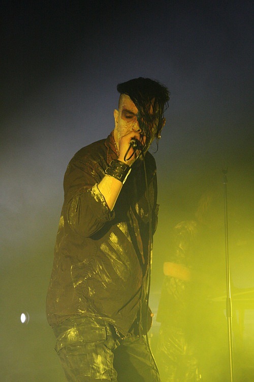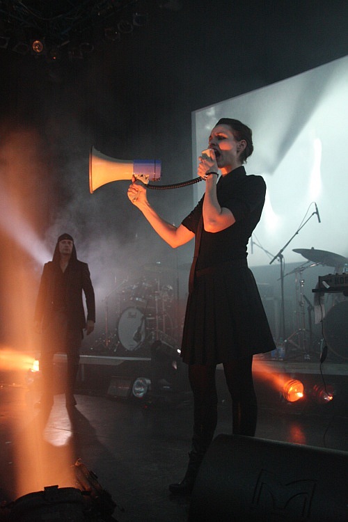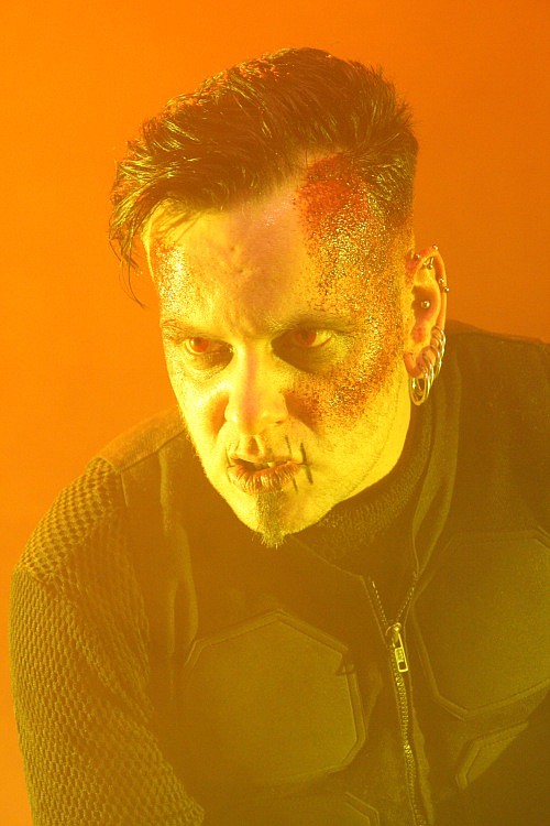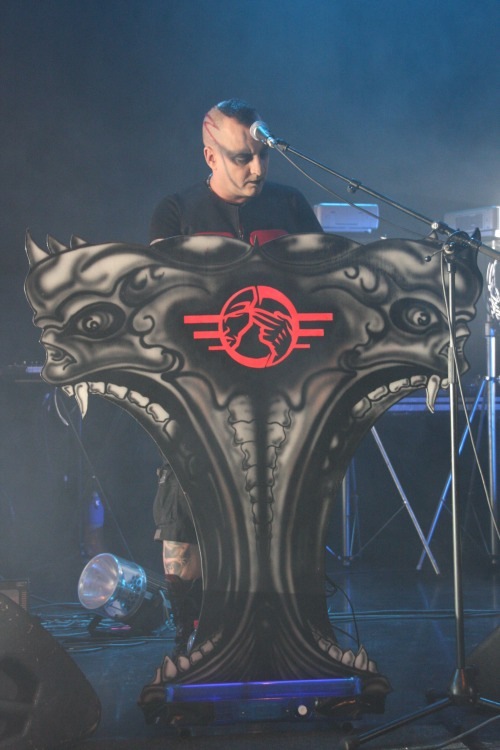 Das Hellectro-Trio AGONOIZE ist für seine mitunter spektakuläre Show bekannt und auch an diesem Abend hat man dem Publikum optisch so einiges zu bieten. Das fängt bei den beiden Keyboard-Ständern im Alien-Look an, geht weiter mit der guten Lichtshow und endet beim auffälligen Styling der Protagonisten. Zum nach dem Intro eröffnenden "A Cut Inside My Soul" erscheint Frontmann Chris L. in Zwangsjacke auf der Bühne und spielt auch mit seiner Mimik sehr überzeugend den Psychopathen. Befreit springt er danach zu "Schaufensterpuppenarsch" über die Bühne und beim folgenden "Bis das Blut gefriert" bringt er dann ein großes Messer mit nach vorne. Damit simuliert er dann das Aufschneiden der Pulsadern und spritzt mit einer Blutfontäne in der Gegend herum. Schön plakative Show, die GWAR und ALICE COOPER auch nicht besser hinbekommen. Musikalisch geht es mit hämmerndem und eingängigen Hellectro in Form von "Alarmstufe Rot" und "Death Murder Kill" weiter, bei letzterem kommt erneut Kunstblut zum Einsatz, es folgen "Staatsfeind" und "Bäng Bäng Goodbye". Zum Ende hin wird es anrüchiger, zunächst wird die "Femme Fatale" beschimpft, bevor man sich der "Koprolalie" widmet. Zum größten Hit seiner Band kommt der Sänger im Mantel auf die Bühne, nestelt an diesem herum um dann einen präparierten Dildo zu präsentieren, aus dem sich kurze Zeit später eine weißliche Flüssigkeit über das Publikum ergießt. Das mag man zurecht als schwer trashig empfinden, unterhaltsam ist es - wie der gesamte Auftritt - aber alle mal.