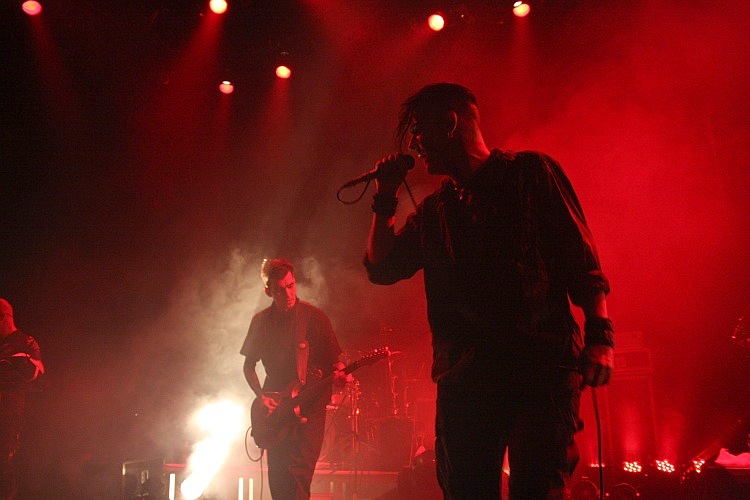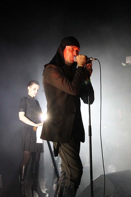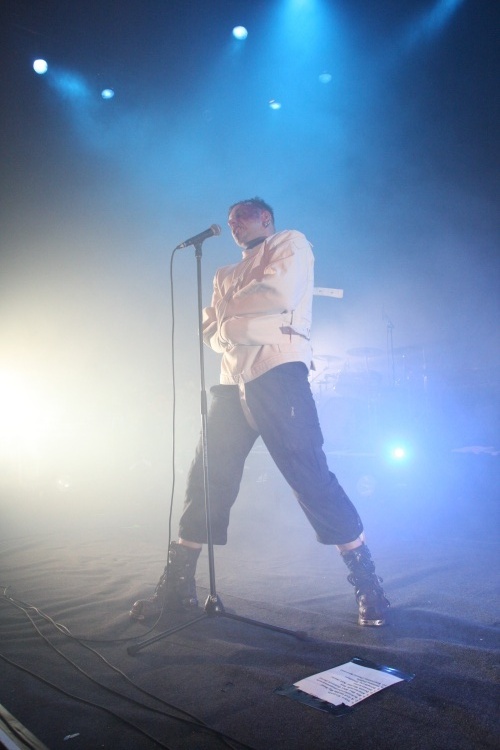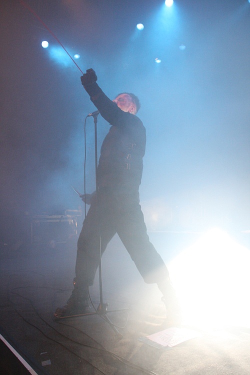 Gut 2.000 Zuschauern bietet die runde Location Platz. So viele werden es zwar nicht sein, die an diesem eisigen Winterabend das Tanzbein schwingen wollen, das Theater ist trotzdem besser gefüllt, als zu erwarten war, schätzungsweise 1.500 Gäste wollen sich die Auftritte der fünf Bands anschauen. Auffällig ist, dass der neon-schwarze Gothic-Nachwuchs heute kaum vertreten ist, stattdessen findet man ein vergleichsweise älteres Publikum vor, das wohl die Helden der Jugend abfeiern will. Die FIELDS OF THE NEPHILIM-Fans sind dabei deutlich sichtbar in der Überzahl, man sieht aber auch viele PROJECT PITCHFORK-Shirts und manch uniformierten LAIBACH-Anhänger. In der Halle angekommen darf man zunächst einmal an den üppig ausgestatteten Merchandise-Ständen sein Weihnachtsgeld ausgeben, bevor es pünktlich um 19 Uhr auf der recht großen Bühne los geht.