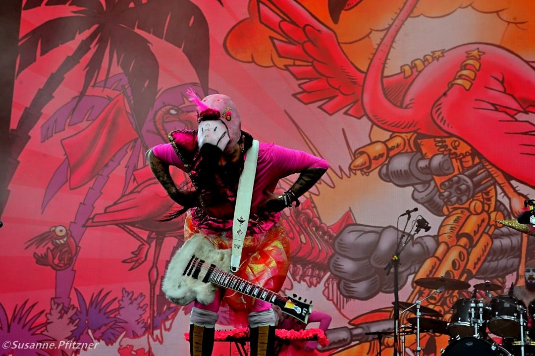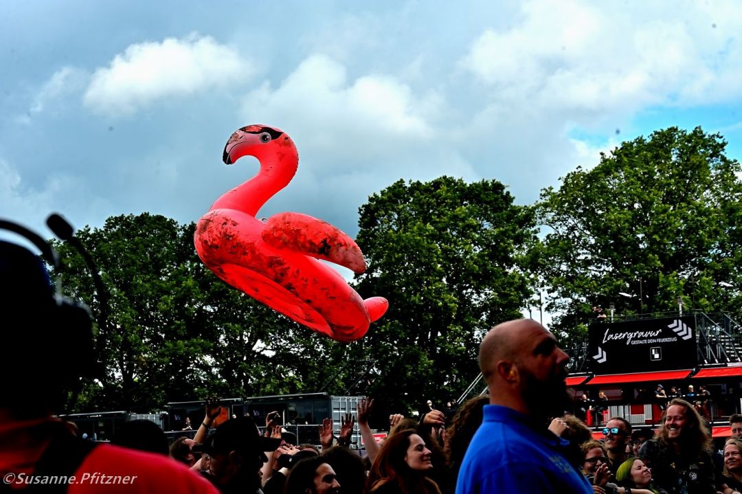 Nach 20 Minuten Verspätung öffnen sich die Tore, und das Publikum rennt zur Bühne. Doch… nichts passiert. Erst nach einer gefühlten Ewigkeit tritt jemand vom Orga-Team auf und erklärt: Komplettes Technik-Setup musste neu gestartet werden. Dann endlich: TROLLFEST in voller Farbenpracht. Schrille Vogelkostüme, ein pink-orangefarbener Bühnenhintergrund und ein Flamingo, der im Crowdsurfing-Stil von der Bühne ins Publikum segelt. Die Mischung aus Balkanrhythmen, Metalriffs und aberwitziger Showeinlagen bringt alle zum Lachen – selbst hartgesottene Fotografen.