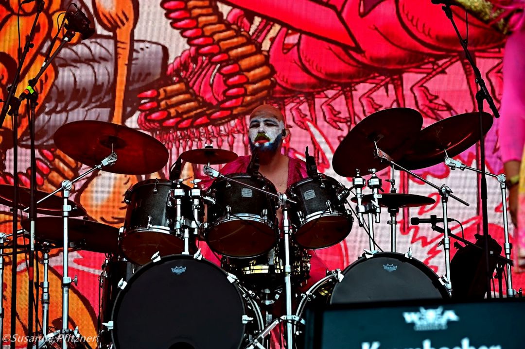 Um 16:30 Uhr übernimmt MASTODON auf der Faster Stage. Die US-Progressive-Sludge-Ikonen tauchen die Bühne in ein Meer aus Orange – die Lichtshow wirkt wie flüssige Lava, die über die Menge fließt. Trotz einsetzendem Nieselregen bleiben die Reihen dicht, und die Fans singen lauthals mit.
