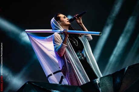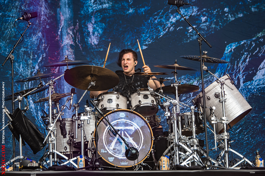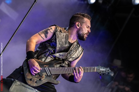 Pünktlich zum Start der Abendkonzerte, reißt dann auch die bis dato dichte Wolkendecke auf und taucht das Infield in goldene Farbtöne. Mit den Niederländern von WITHIN TEMPTATION steht eine Band auf der Bühne, die den Symphonic Metal schon seit ihrer Gründung im Jahr 1996 prägen. Auch das aktuelle Album „Resist“ thront weit über dem Durchschnitt des Genres. Sharon den Adel und ihre Mitstreiter habe daher auch keine Mühe, das Infield, das nun wieder rappelvoll ist, auf ihre Seite zu ziehen. Neben der Frontfrau, die stets für die Showelemente zuständig ist, liefert auch ihre Band gnadenlos ab. Stefan Hellenblad, der die fetteste Axt aus dem Haus Jackson Guitars sein Eigen nennt, hämmert auf ein Instrument ein, das statt der gewöhnlichen sechs Saiten, derer acht besitzt. Das Bild hier im Fließtext wurde von ihm und auf dem offiziellen Intagram-Accout von WITHIN TEMPTATION geteilt, was den Fotografen selbstverständlich extrem erfreut hat.