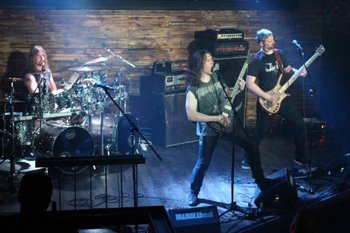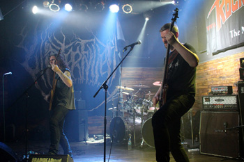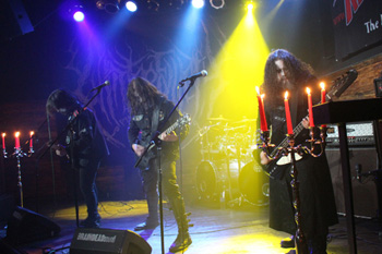 Den Auftakt macht das Quartett NECRONAUTICAL aus dem englischen Nordwesten, das sich nicht nur traditionell herausgeputzt hat, sondern auch redlich bemüht, jeden Einzelnen im Rockpalast mit seiner Musik zu bewegen. Frontmann Naut nimmt mit den wenigen Gestalten vor der Bühne Augenkontakt auf, wenn er nicht gerade den Zombie mimt (was er recht gut beherrscht). Während die Jungs einige trotz ihrer Länge vergleichsweise eingängige Songs zum Besten geben, ertappe ich mich dabei, angesichts der von Kerzen illuminierten Bühne "typisch Cacophonous" zu denken, denn dieses völlig überholte Erscheinungsbild erinnert ein bisschen an Abyssos (r.i.p.), deren hochmelodische Musik vom englischen Label einst mit einem billigen Vampir-Image kaschiert wurde. Auch NECRONAUTICAL hätten derlei Mummenschanz im Grunde nicht nötig. Ihr Black Metal geht beim ersten Hören gut ins Ohr, und für Abwechslung sorgt vor allem Basser Anchorite, der gegen Ende des Gigs mit epischem Klargesang überrascht. Angesichts der undankbaren Umstände schlägt sich die Band tapfer.