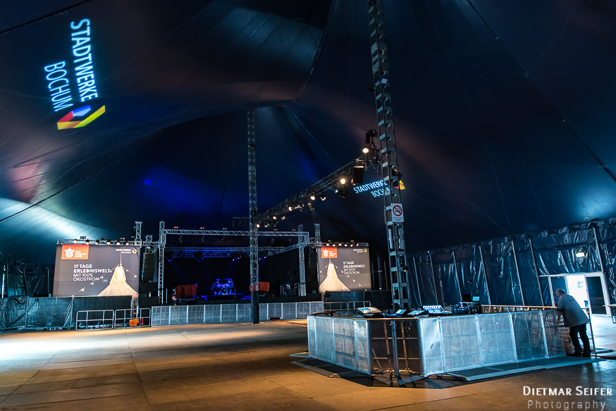 Um 19:30 Uhr öffnete sich dann die Zeltplane für die Besucher des OMD-Konzerts im Stadtwerke-Zelt. Bis zum Vormittag war das Konzert noch nicht ausverkauft. So schleppend, wie sich das Zelt zu füllen begann, hatte ich die Befürchtung, dass es zur Hälfte leer bleiben würde. Als aber dann um 20:30 Uhr Andy McCluskey und seine Zeltgesellen die Bühne betraten, war das 2000 Personen fassende Zelt bereits gut gefüllt. Einen Support gab es diesmal leider nicht.